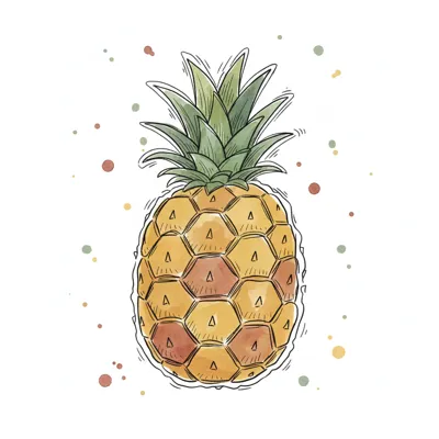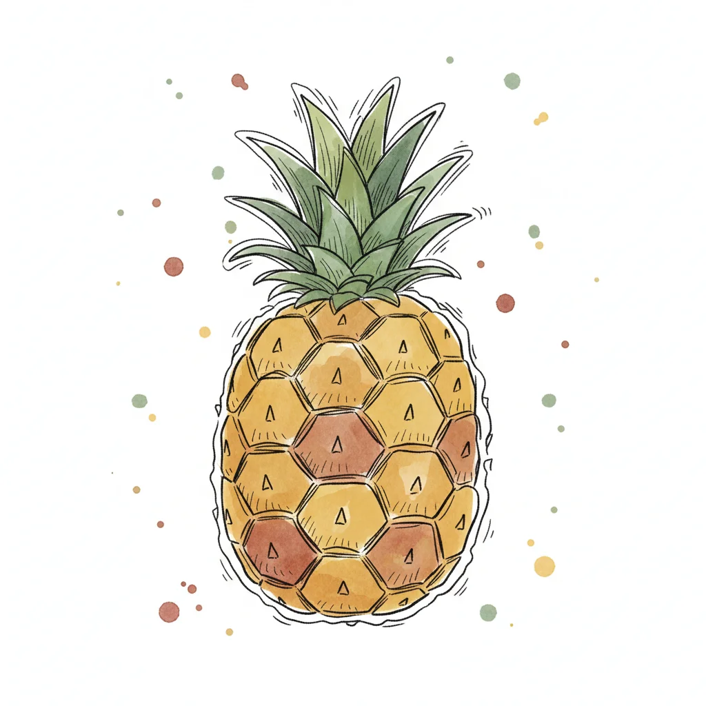 Bunte Aquarell-Ananas-Illustration mit skizzierten Konturen und Farbspritzern auf weißem Grund.