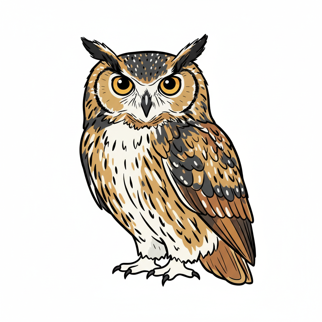Eine detaillierte, farbenfrohe Zeichnung einer Eule im Stehen.