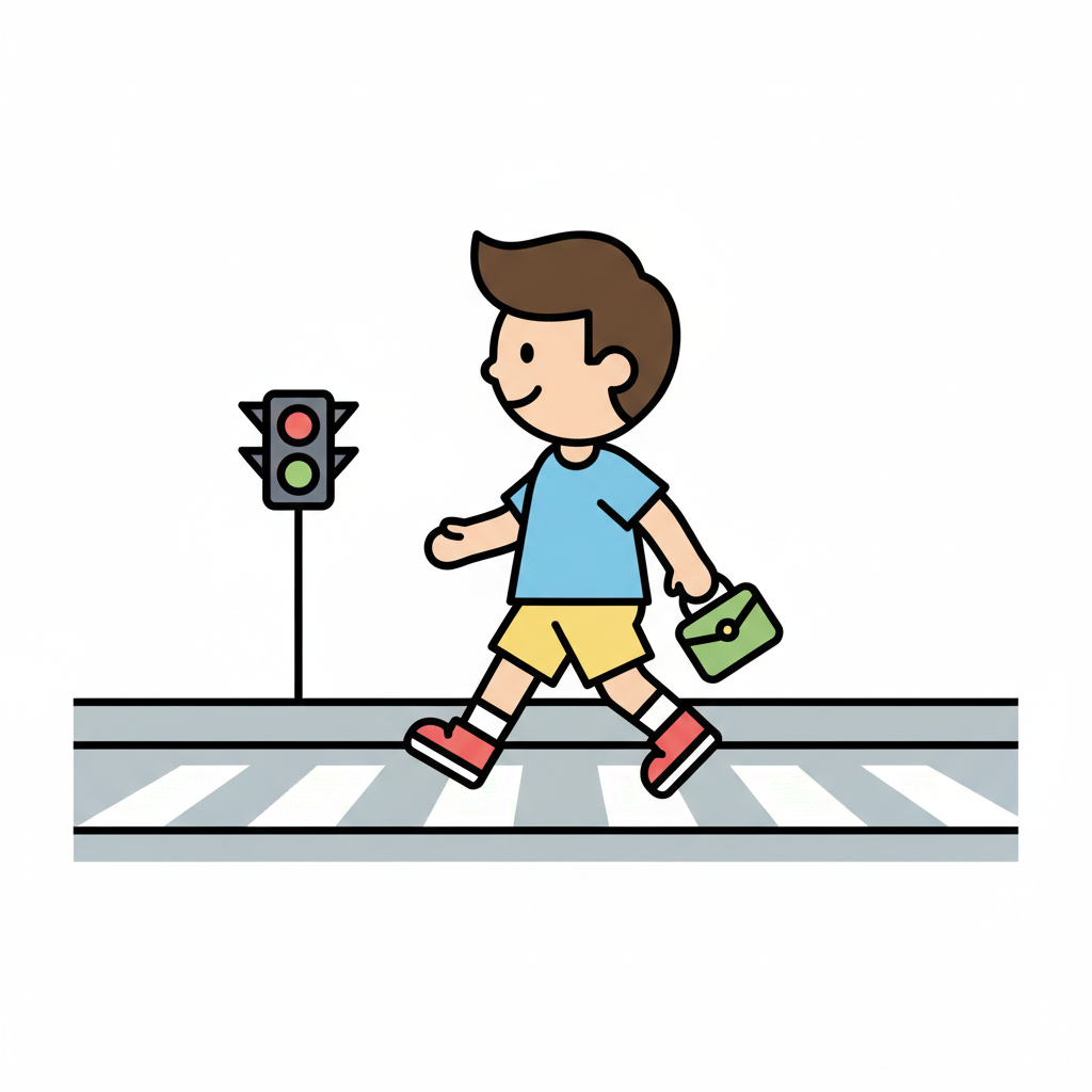 Ein Cartoon-Junge überquert einen Zebrastreifen bei grüner Ampel und trägt eine Tasche.