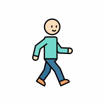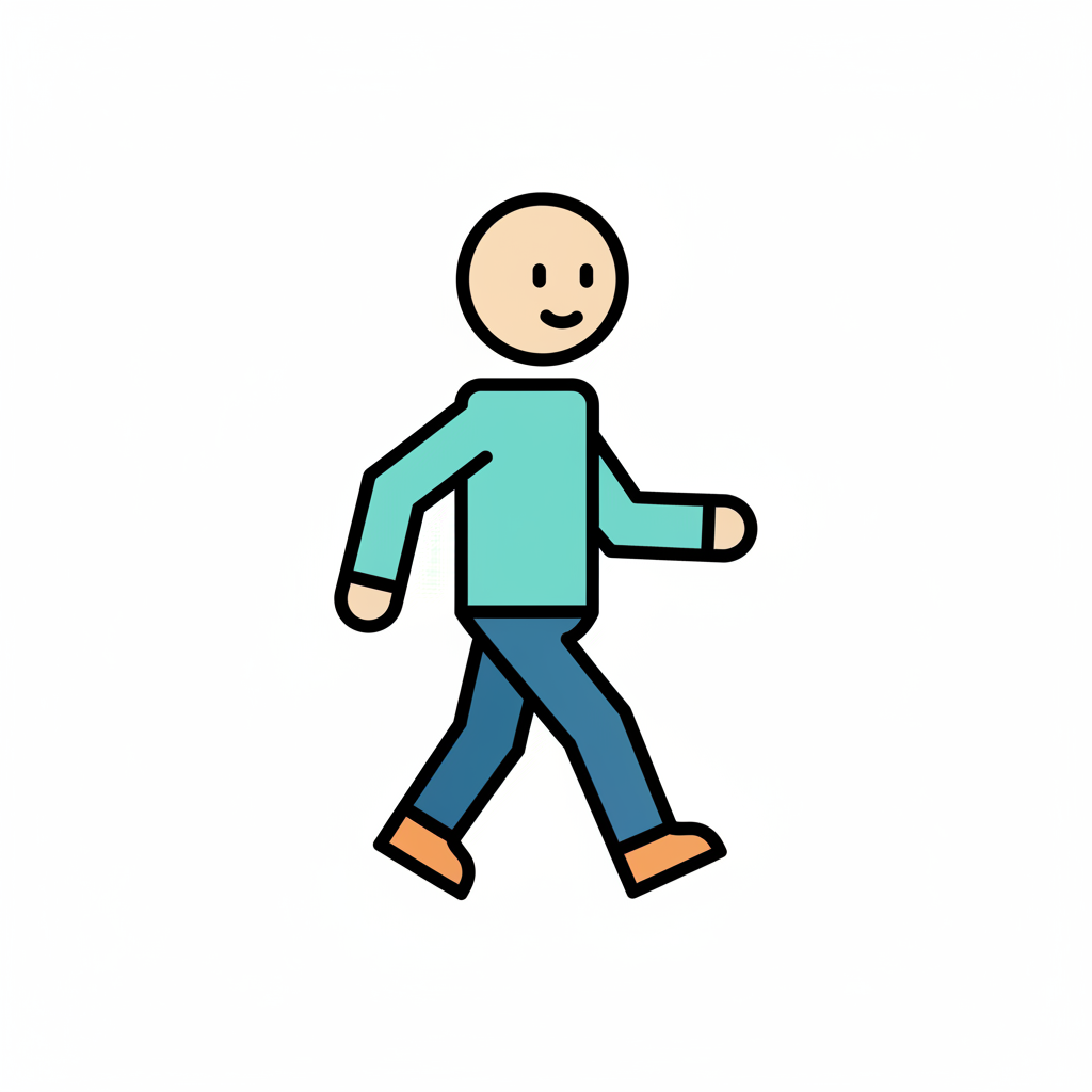 Ein lächelndes Strichmännchen in blauer Kleidung geht nach rechts.