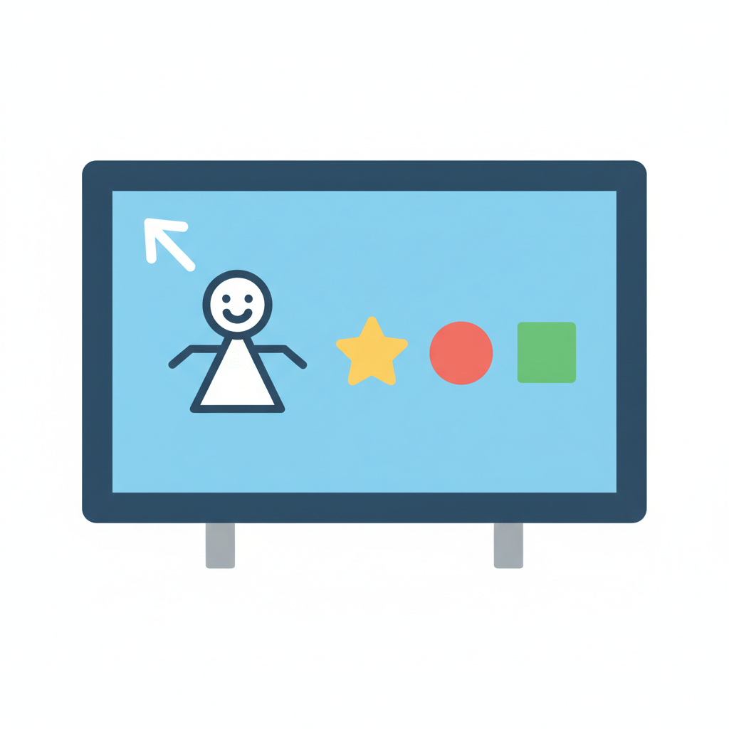 Strichmännchen, Pfeil und geometrische Formen (Stern, Kreis, Quadrat) auf einem Bildschirm.