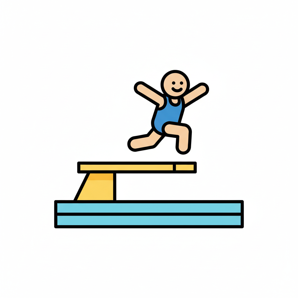 Ein fröhliches Strichmännchen springt von einem Sprungbrett ins Wasser.