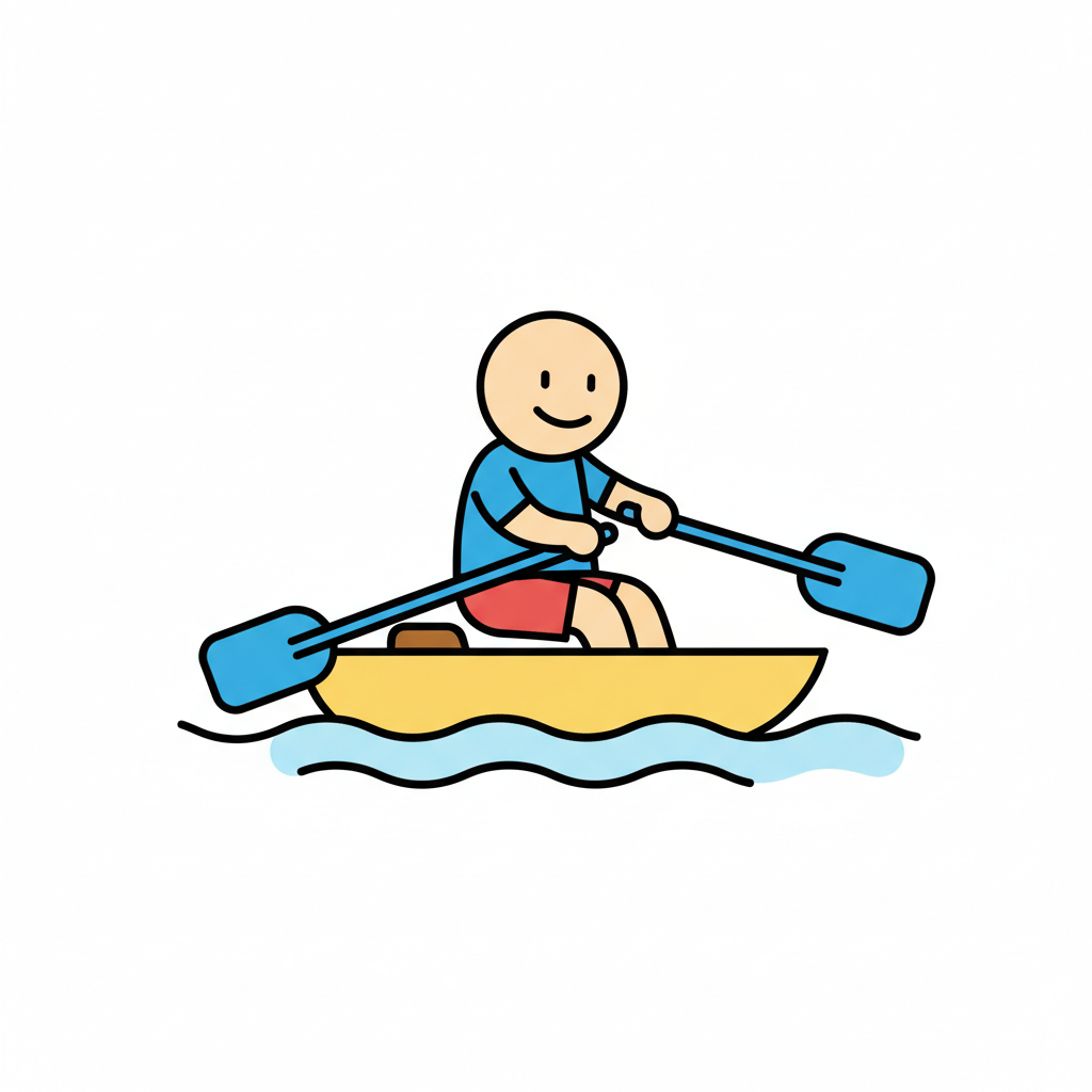 Ein lächelndes Strichmännchen rudert in einem gelben Boot auf blauem Wasser.