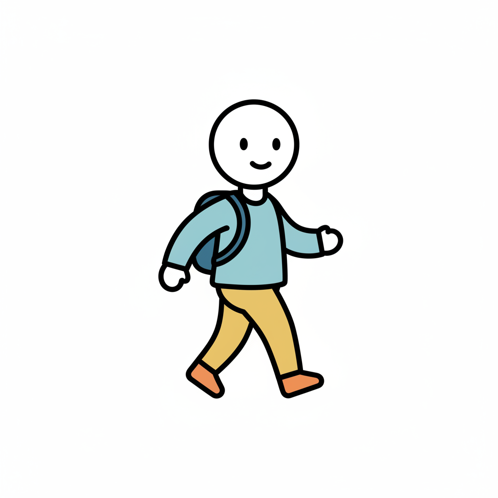 Ein lächelndes Strichmännchen mit blauem Rucksack und Kleidung geht nach rechts.