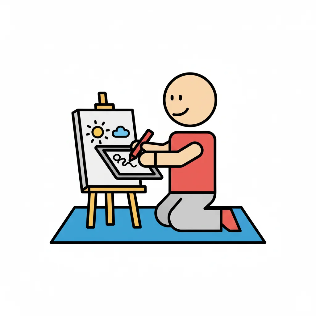 Strichmännchen kniet und zeichnet auf einem Tablet vor einer Staffelei mit Sonne und Wolke.