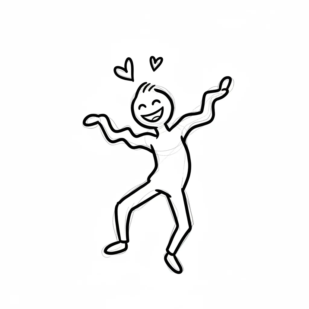Ein freudiger, zeichentrickartiger Mensch tanzt mit Herzen darüber.