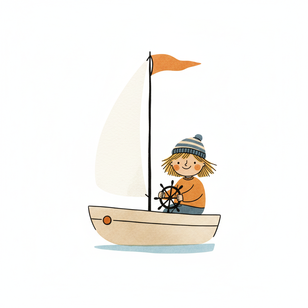 Niedliche Illustration eines lächelnden Kindes in einem Segelboot, das das Steuerrad hält.