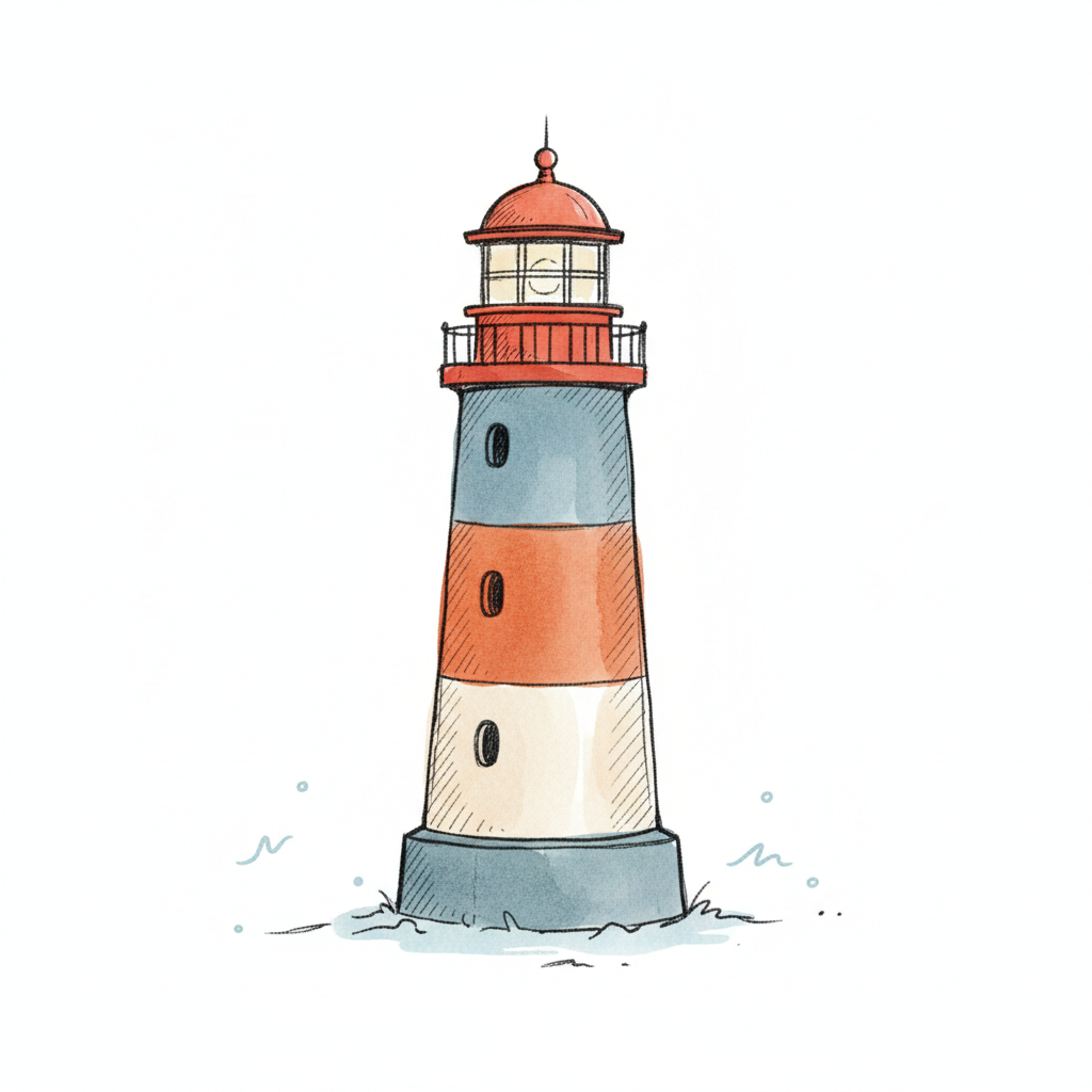 Aquarell-Illustration eines gestreiften Leuchtturms in Rot, Blau und Weiß, umgeben von Wasser.
