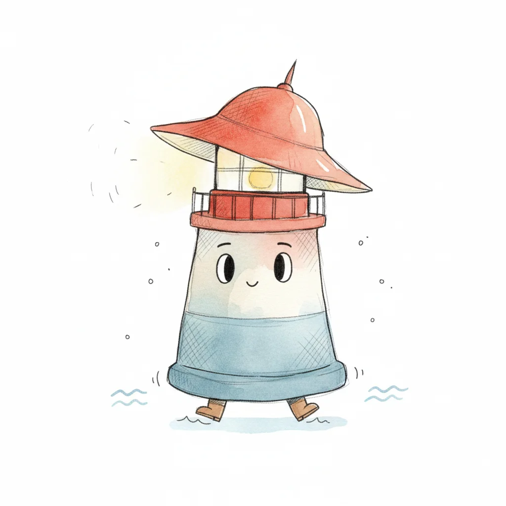 Niedlicher, roter Cartoon-Leuchtturm mit Gesicht und Armen steht im Wasser, umgeben von Vögeln.