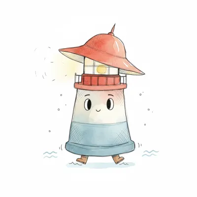 Niedlicher, anthropomorpher Leuchtturm mit Gesicht und Füßen, der im Wasser spaziert.