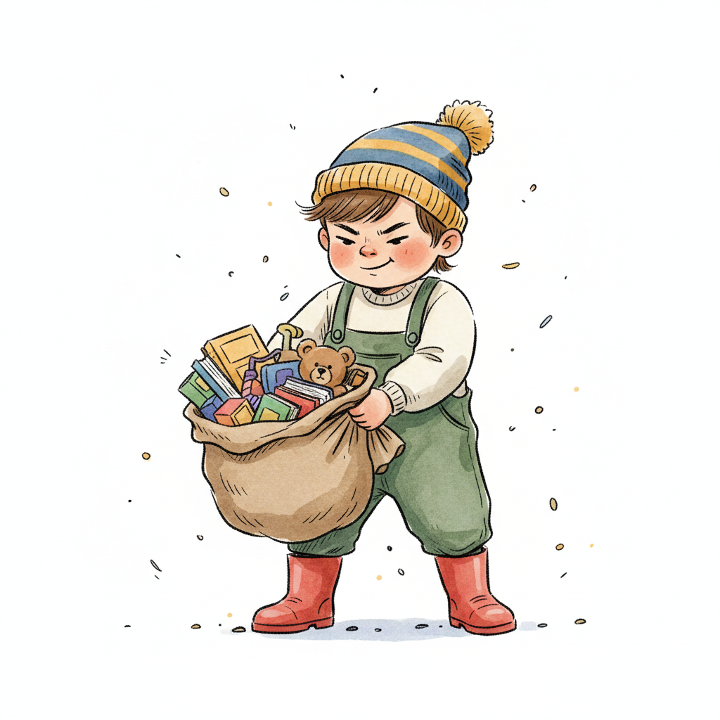 Ein Kind mit Mütze und Latzhose trägt einen Sack voller Bücher und Spielzeug.