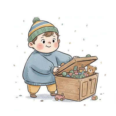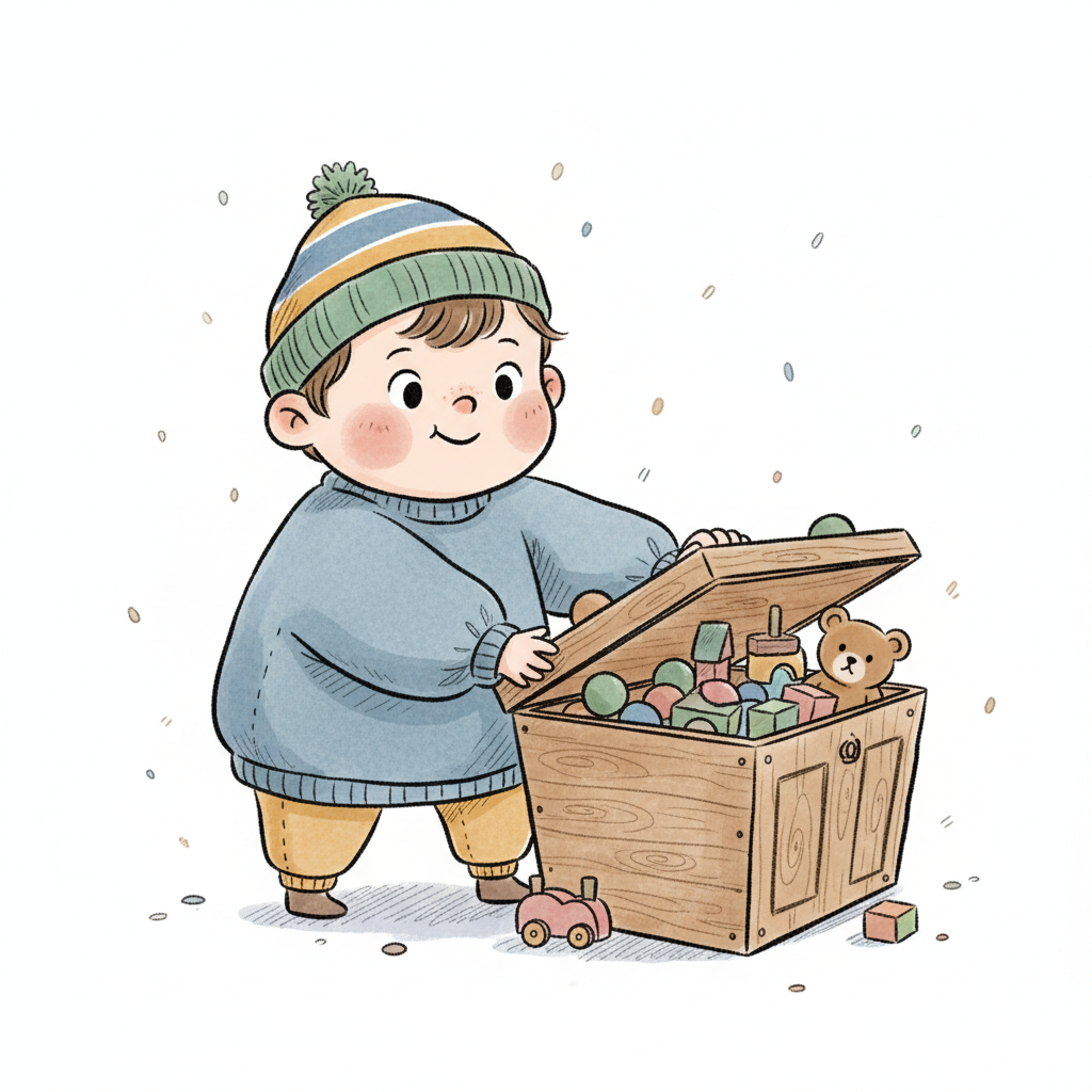 Ein lächelndes Kind in Winterkleidung öffnet eine Holzkiste voller bunter Spielsachen.