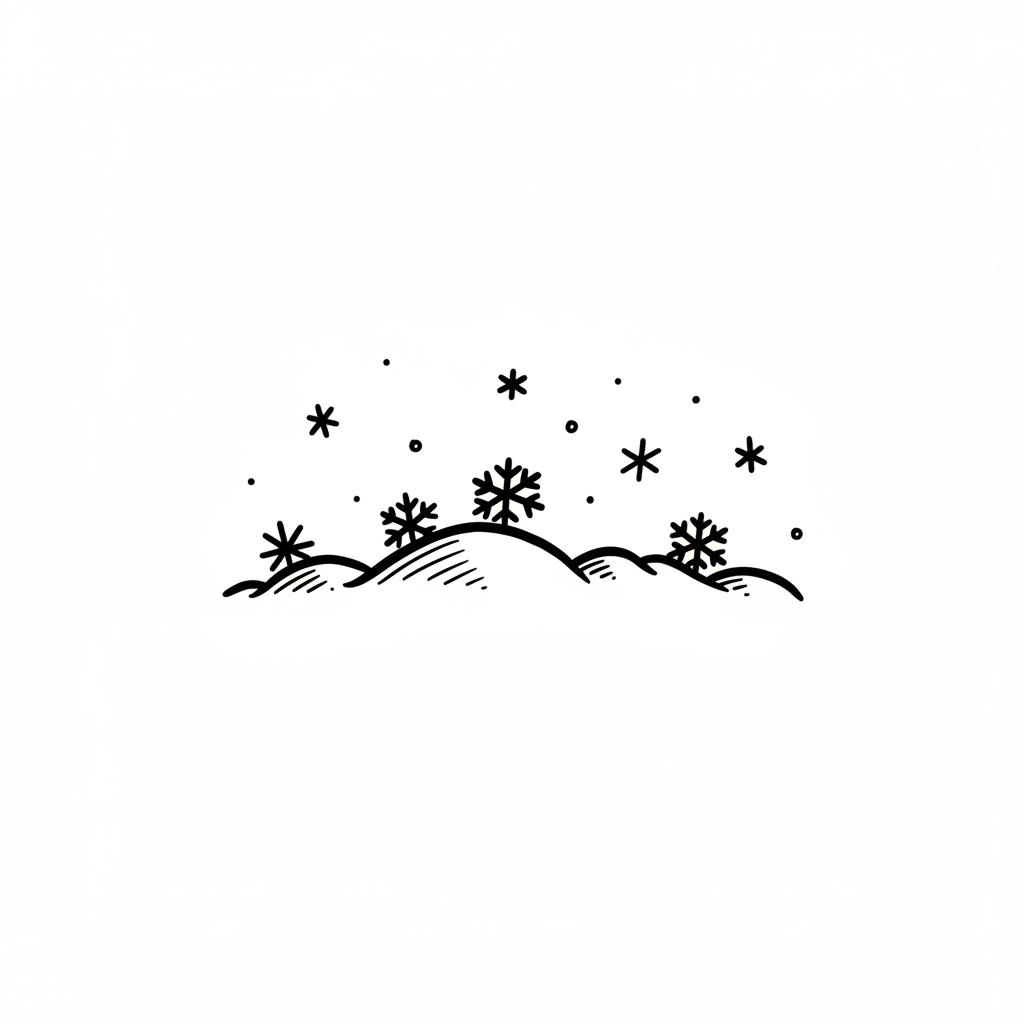 Schlichte, monochrome Zeichnung von Schnee und Schneeflocken auf Hügeln.