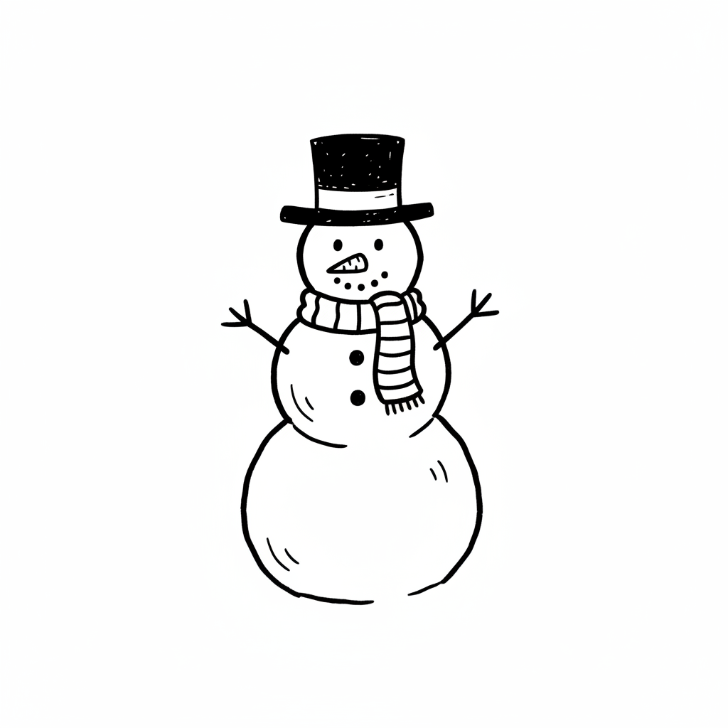 Ein gezeichneter Schneemann mit Hut und Schal, fröhlich und winterlich.
