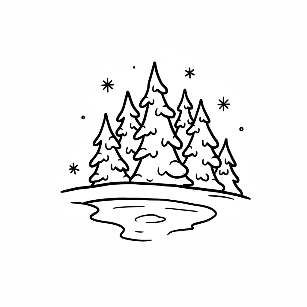 Skizze von verschneiten Bäumen und einem kleinen Gewässer.
