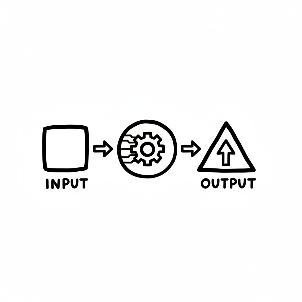 Flussdiagramm: Input wird durch einen Prozess (Zahnrad) zu Output verarbeitet.