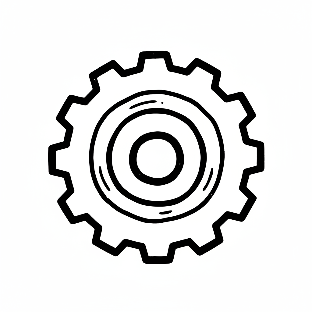 Handgezeichnete, schwarze Umrisszeichnung eines Zahnrads auf weißem Hintergrund.