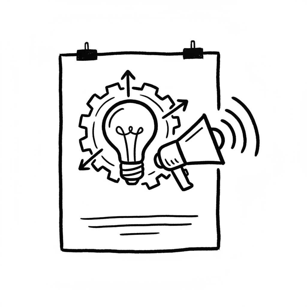 Handgezeichnete Skizze: Glühbirne, Zahnrad und Megafon auf einem Blatt symbolisieren Idee, Prozess, Kommunikation.