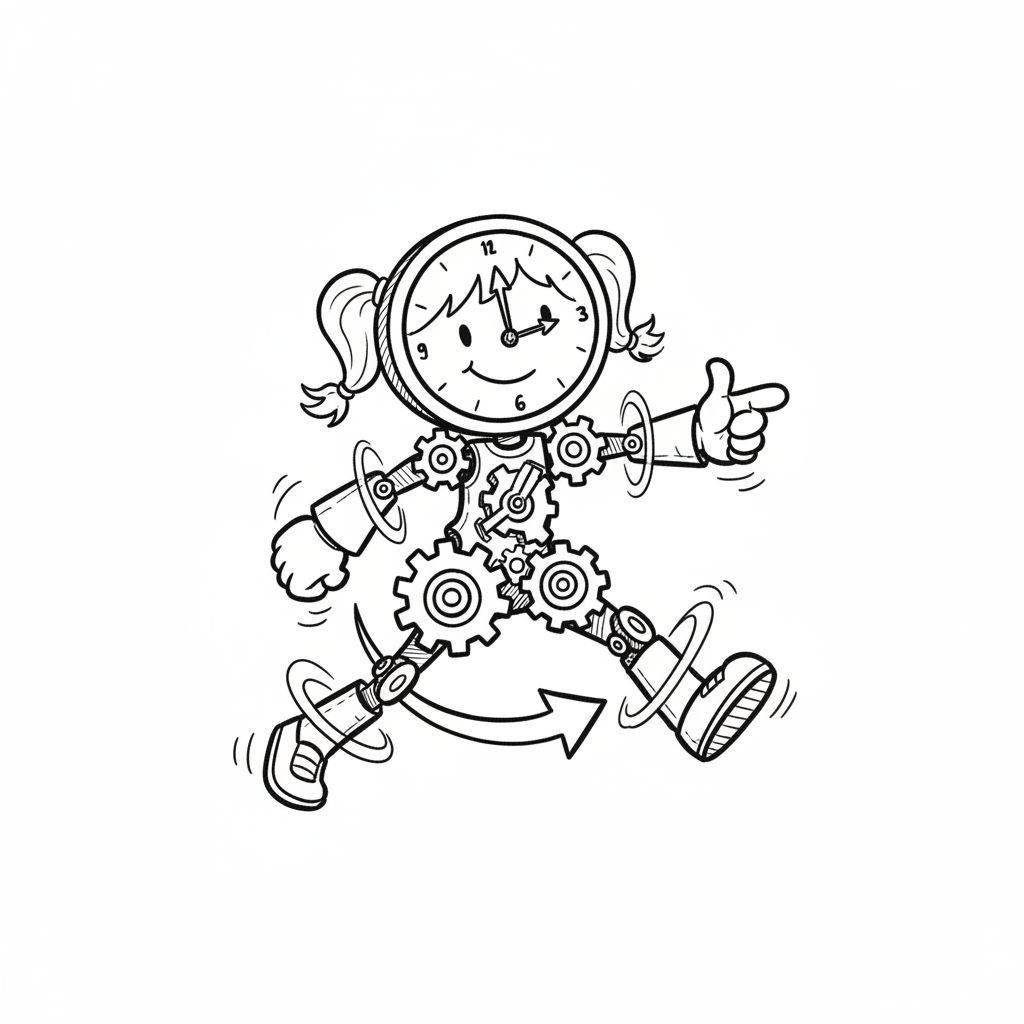 Laufende Cartoon-Uhrfigur mit Zahnradkörper und lächelndem Gesicht, die auf etwas zeigt.