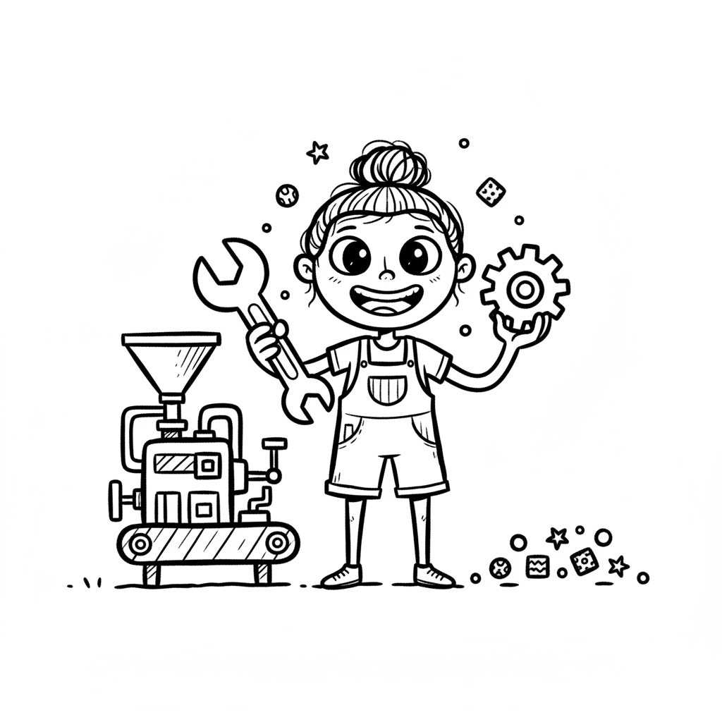 Lachendes Mädchen mit Schraubenschlüssel und Zahnrad vor einer Maschine, wie eine Malvorlage.