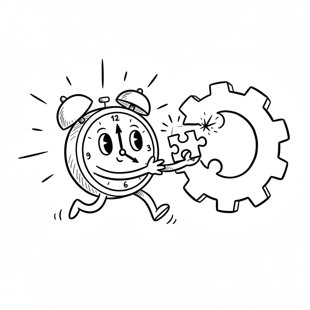 Laufender Cartoon-Wecker fügt ein Puzzleteil in ein Zahnrad ein, symbolisiert Zeitmanagement.