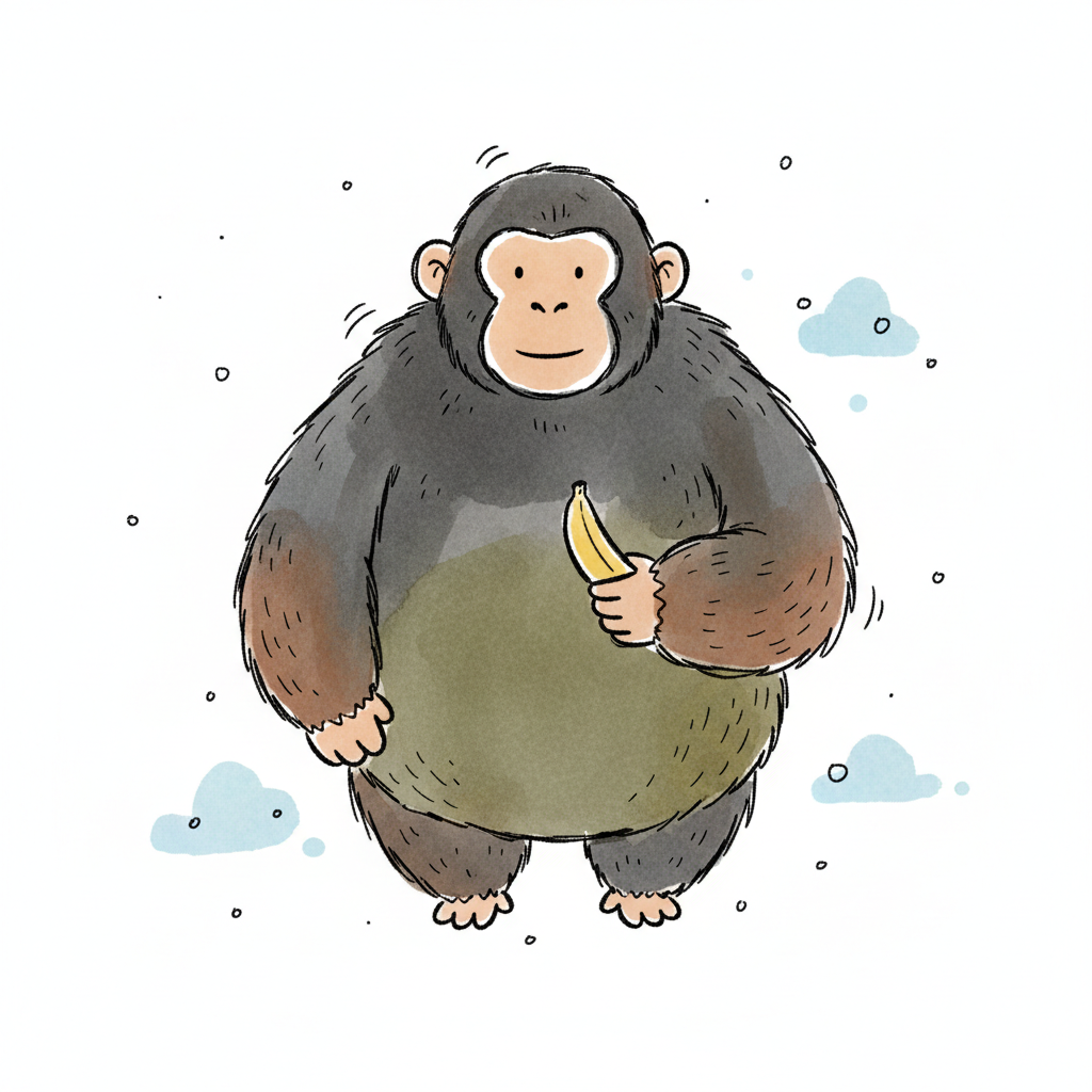 Aquarell-Illustration eines freundlichen Schimpansen, der eine Banane hält.