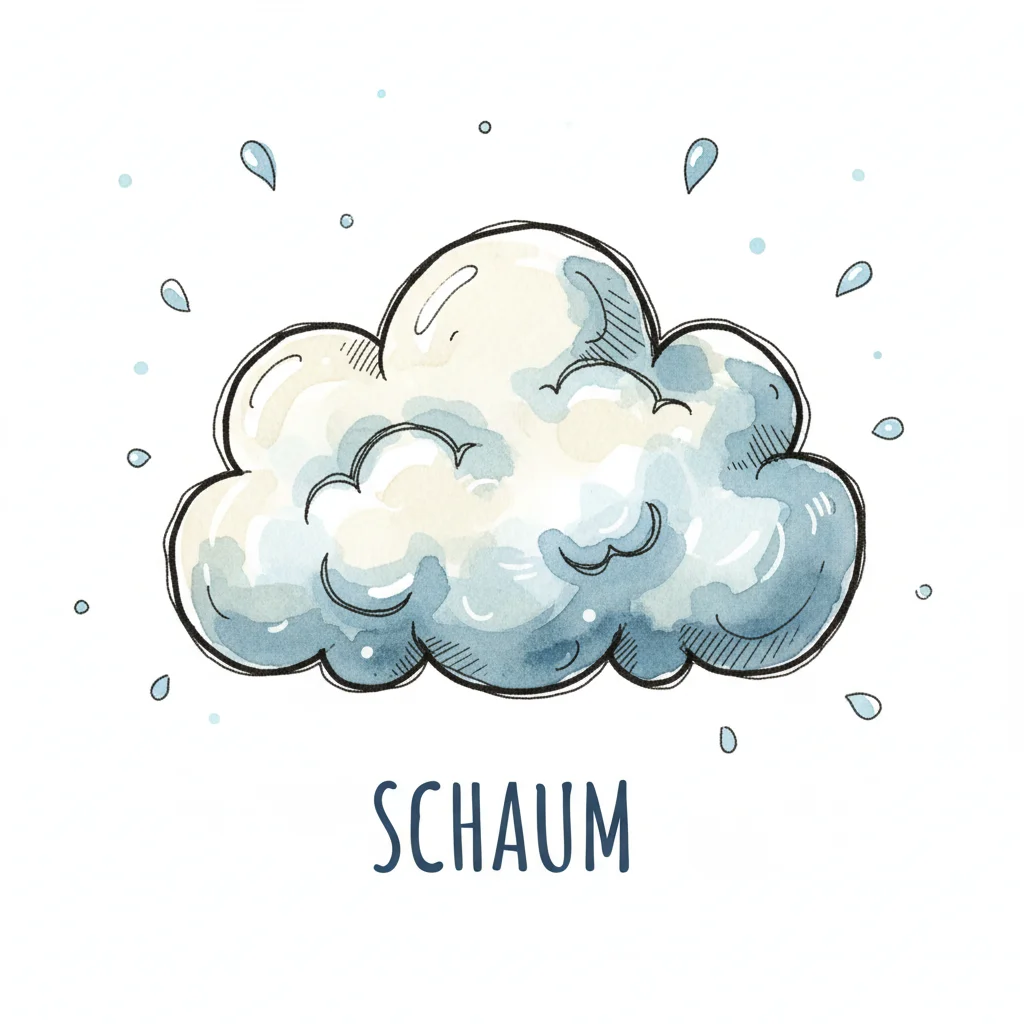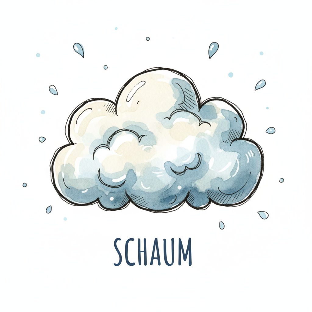 Illustrierte, schaumige Wolke mit Wassertropfen und dem Schriftzug 'SCHAUM' auf weißem Grund.