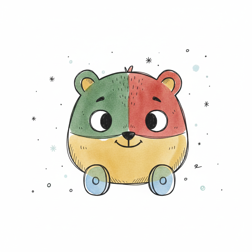 Niedlicher, bunter Cartoon-Bär mit geteiltem Kopf in Grün und Rot, lächelnd auf weißem Grund.