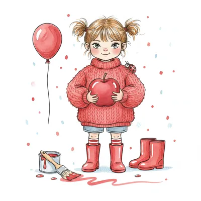 Fröhliches Mädchen in Rot mit Apfel, Marienkäfer, Ballon und Malutensilien.