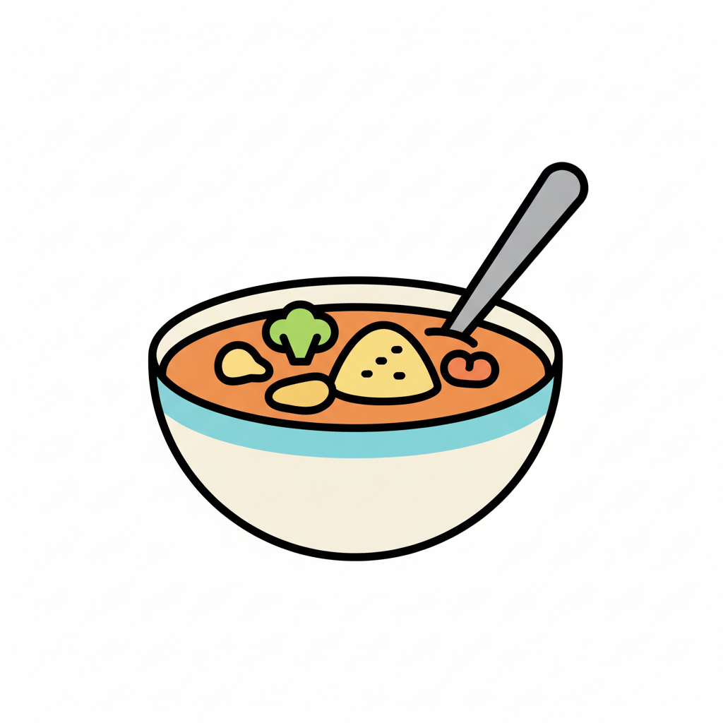 Bunte Zeichentrick-Schüssel mit Suppe, Gemüse und einem Löffel.
