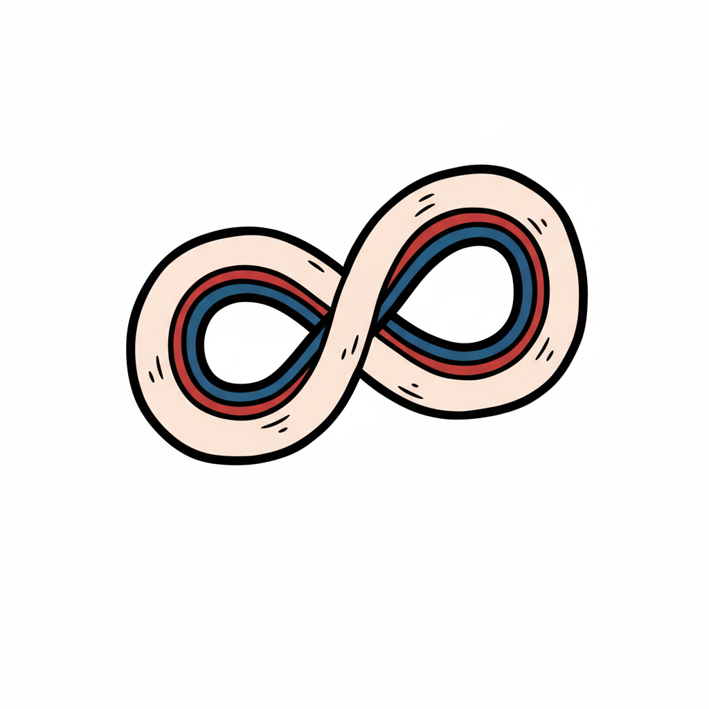 Handgezeichnetes Unendlichkeitszeichen in Beige mit roten und blauen Streifen auf weißem Grund.
