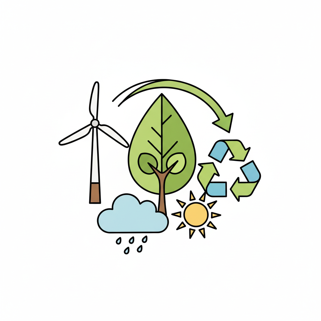 Illustration: Windrad, Blatt, Recycling, Wolke, Sonne. Symbolisiert Umweltschutz & erneuerbare Energien.