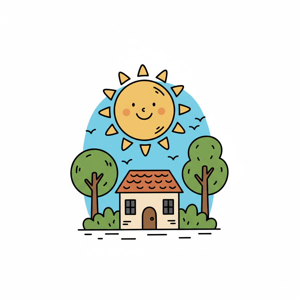 Niedliche Cartoon-Illustration eines Hauses mit Bäumen, Büschen und einer lächelnden Sonne am blauen Himmel.