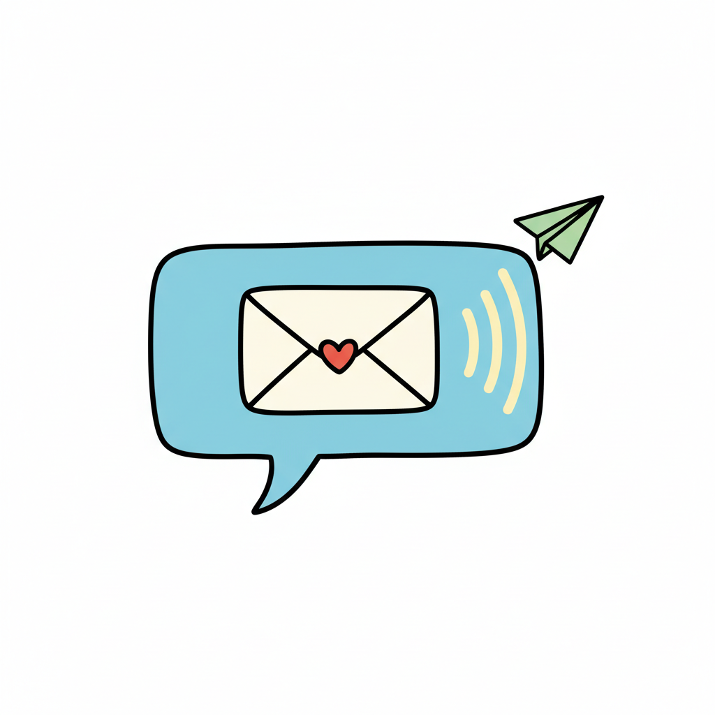Handgezeichnete Sprechblase mit Herzbrief, Signalwellen und abfliegendem Papierflieger.