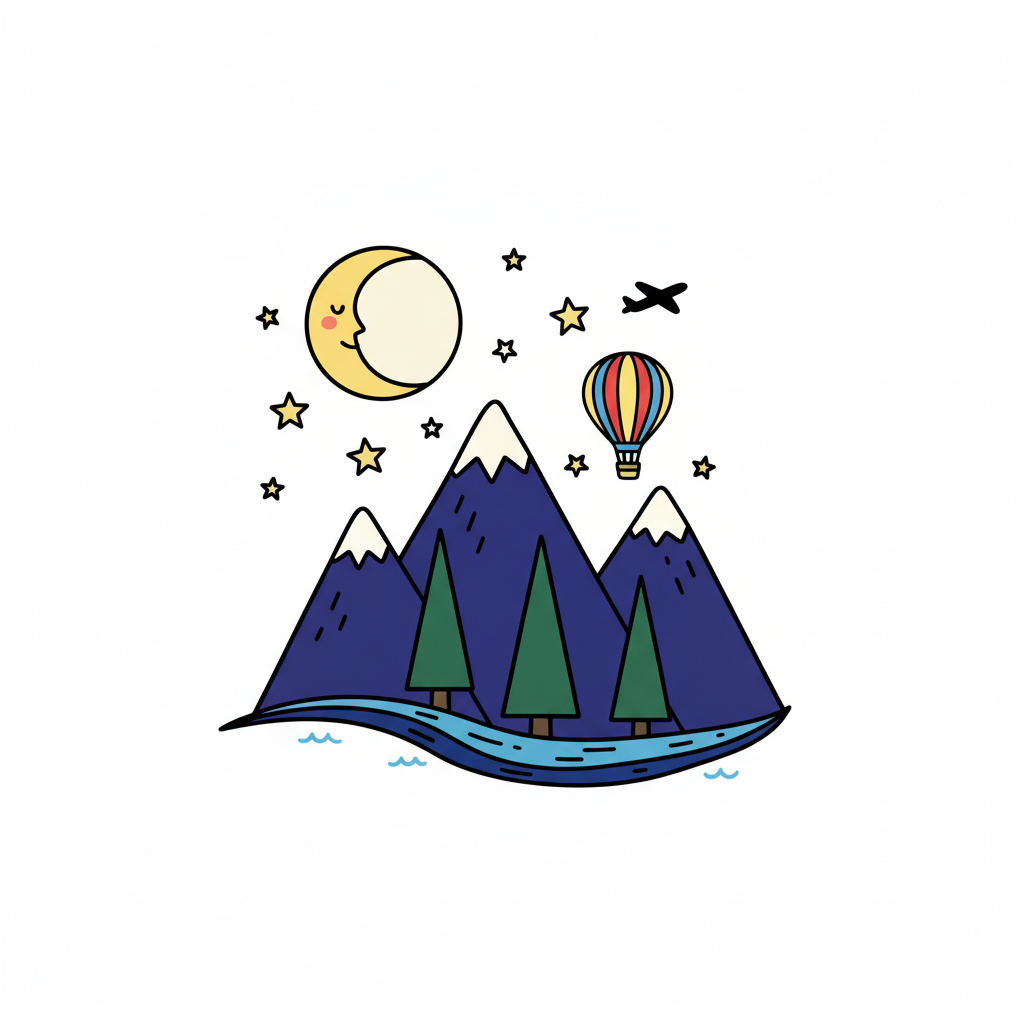 Cartoon-Nachtszene: Berge, Fluss, Bäume, schlafender Mond, Sterne, Heißluftballon, Flugzeug.