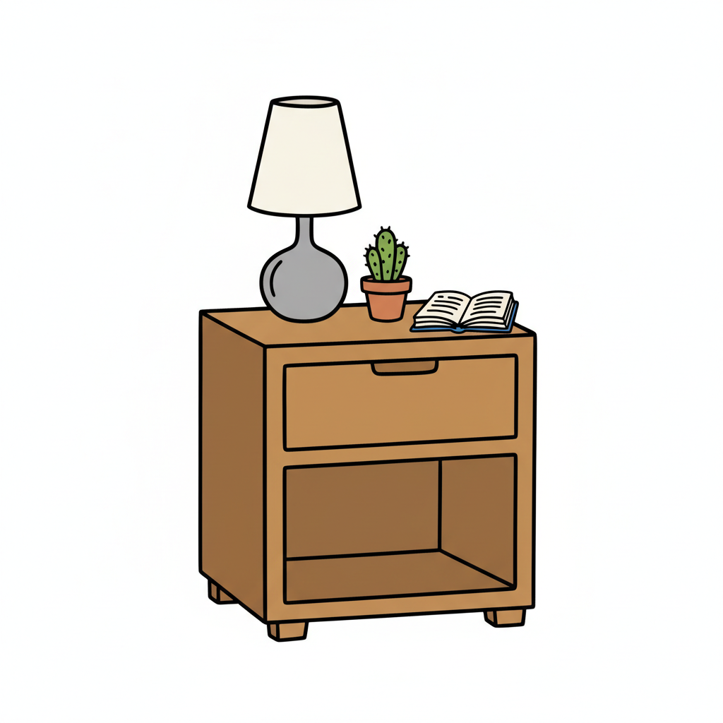 Cartoon eines Nachttischs mit Lampe, Kaktus und offenem Buch auf der Ablage.