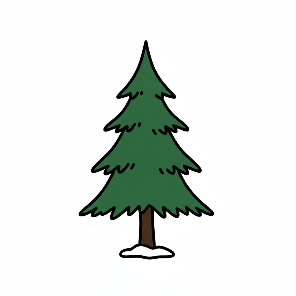 Gezeichneter grüner Tannenbaum mit braunem Stamm und Schnee am Fuß auf weißem Hintergrund.