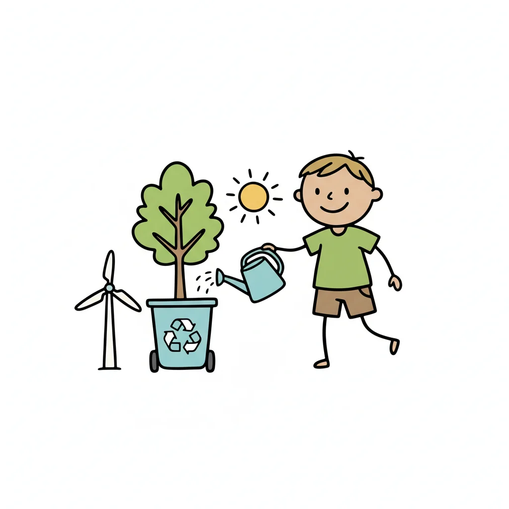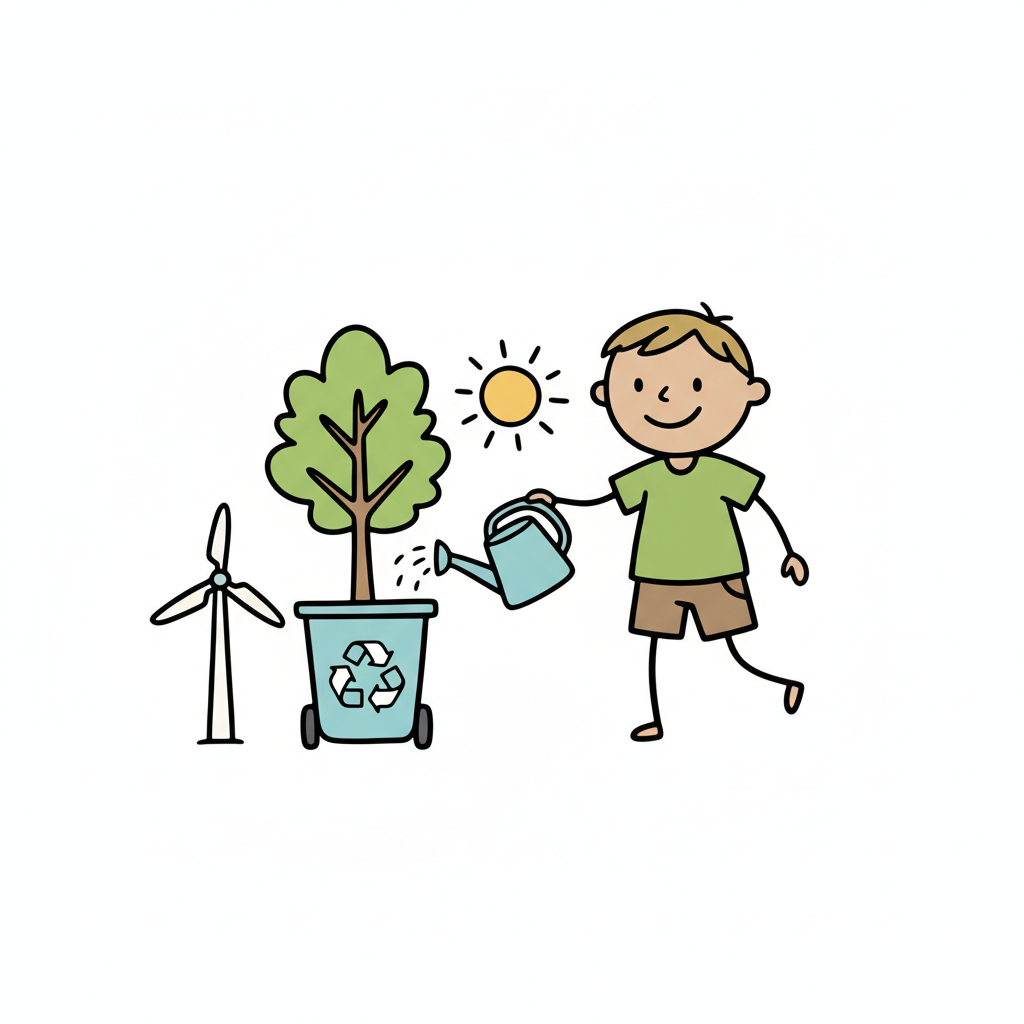 Ein Cartoon-Junge gießt einen Baum in einem Recycling-Behälter, mit Sonne und Windrad im Hintergrund.