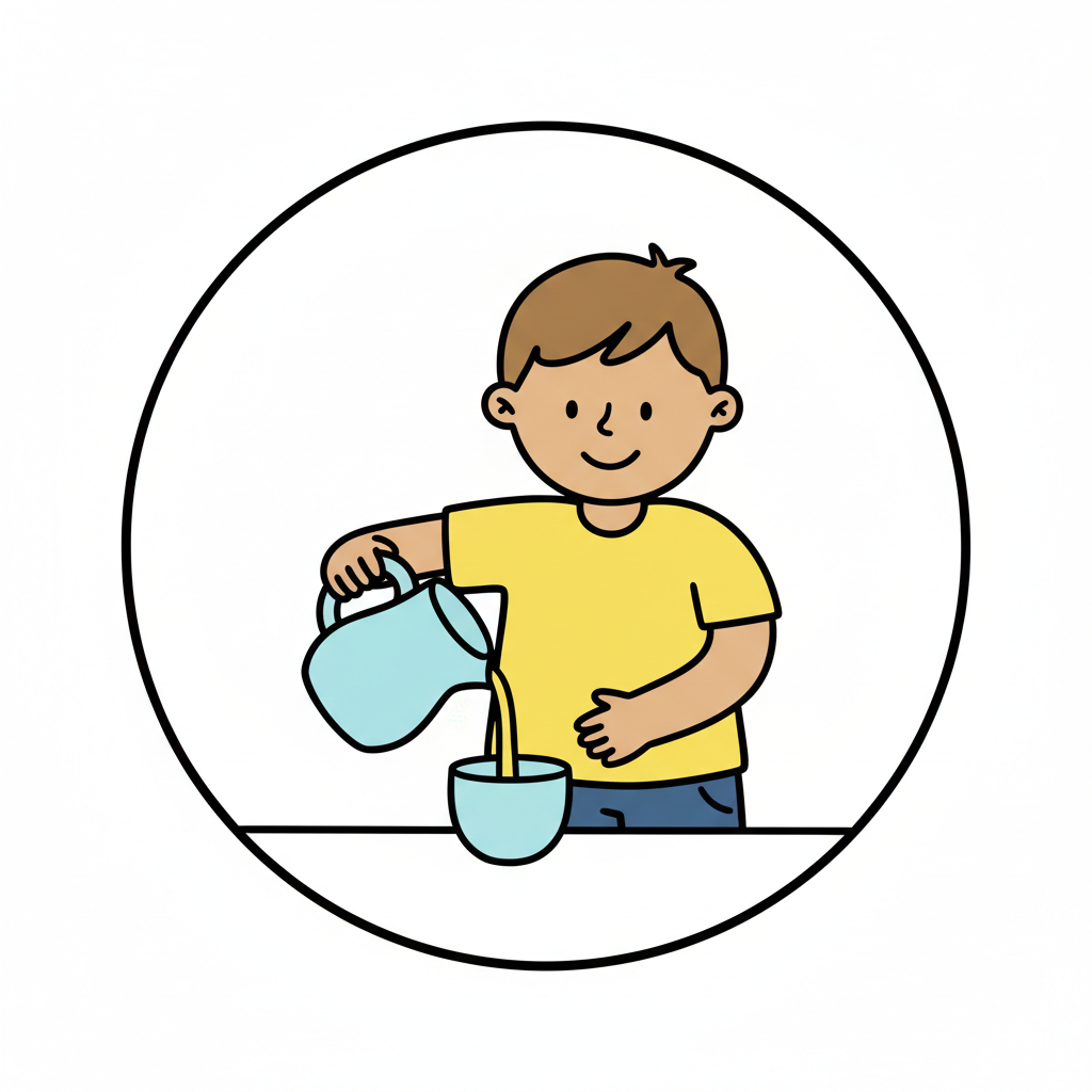 Junge gießt Flüssigkeit aus Krug in Tasse.