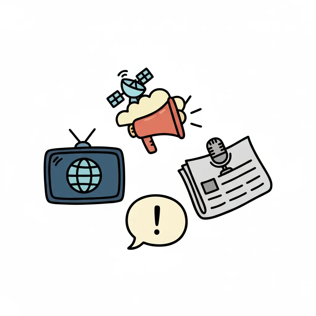 Cartoon-Darstellung von Medien und Kommunikation: TV, Megafon mit Satellit, Zeitung mit Mikrofon, Sprechblase.