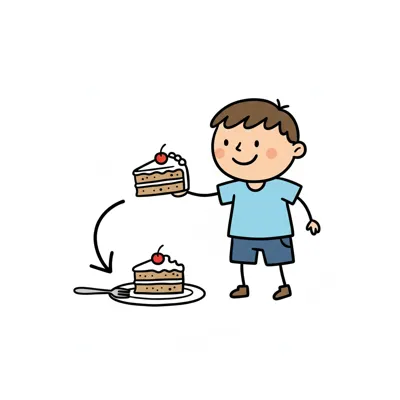 Ein lächelnder Junge hält ein Kuchenstück, das zu einem angebissenen Stück auf einem Teller wird.