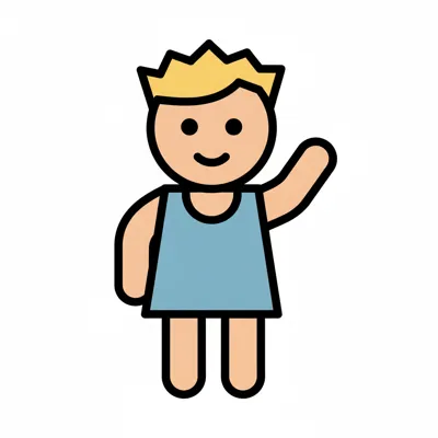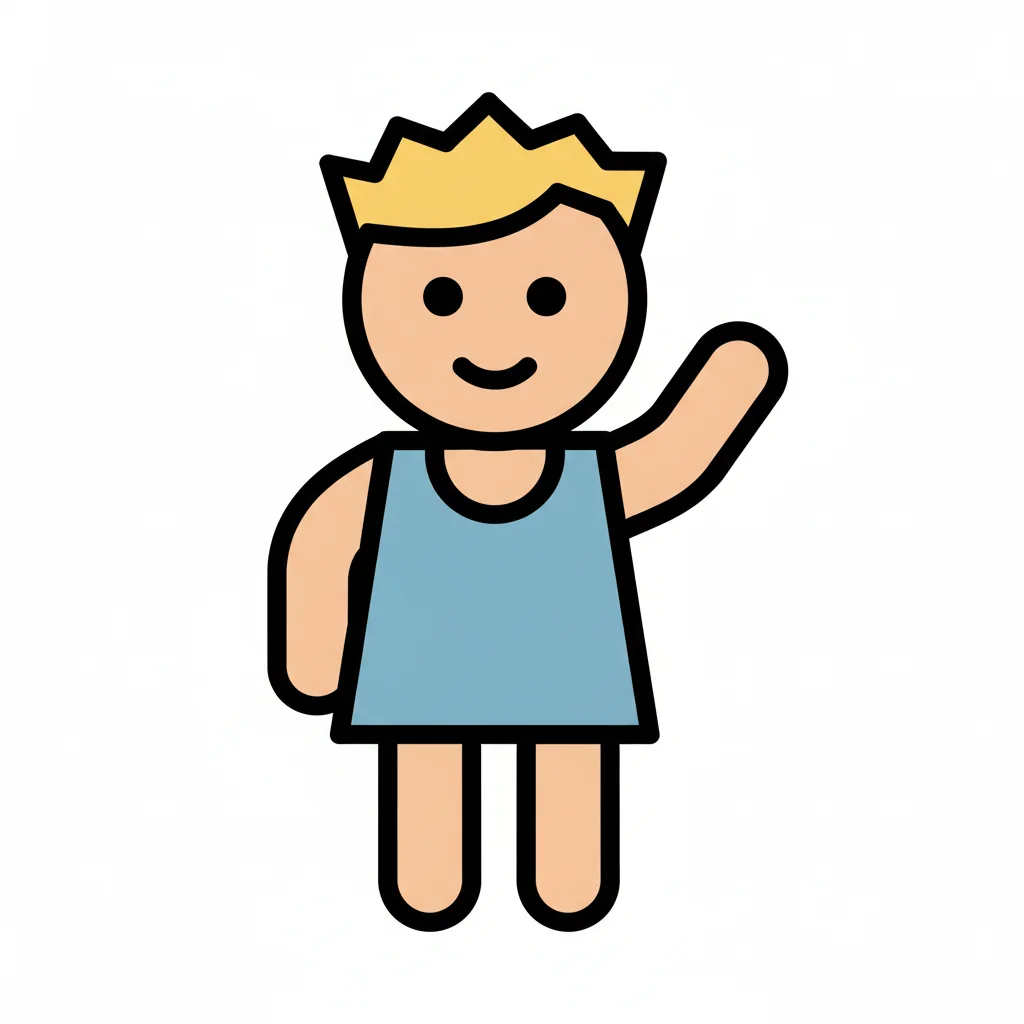 Ein lächelnder Cartoon-Junge in blauem Shirt und beiger Hose winkt fröhlich.