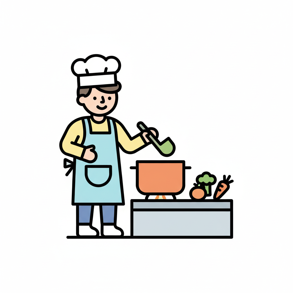Ein lächelnder Cartoon-Koch mit Mütze und Schürze kocht in einem Topf, daneben frisches Gemüse.