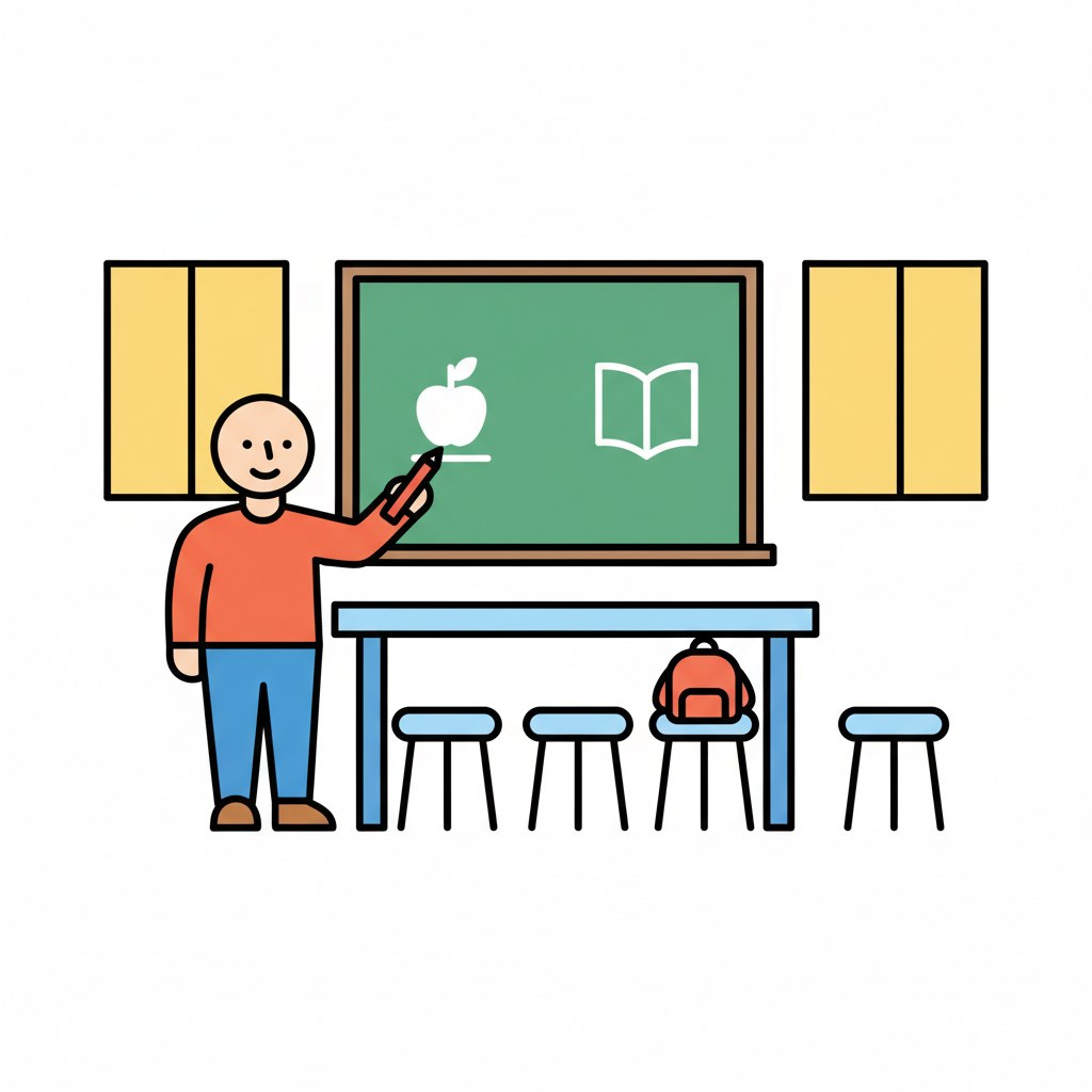 Lehrer-Strichmännchen zeigt auf Tafel, daneben Schreibtisch und Stuhl.