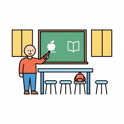 Eine Person zeigt auf eine Tafel mit Apfel und Buch in einem Klassenzimmer mit Tisch und Stühlen.
