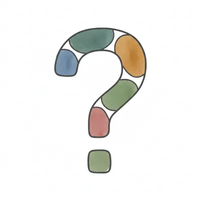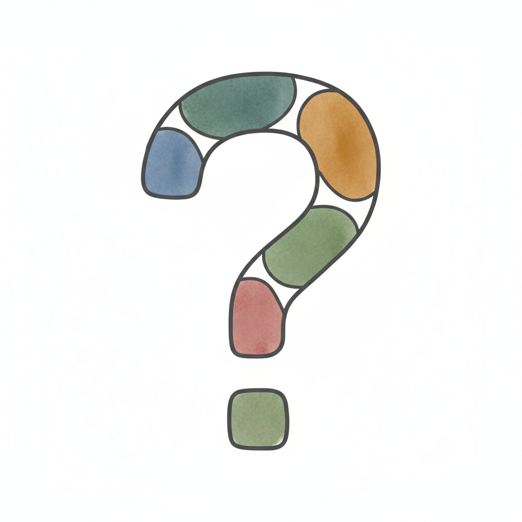Ein farbiges Fragezeichen im Aquarell-Look auf weißem Grund, segmentiert und bunt.