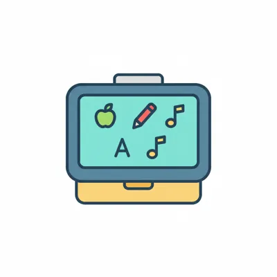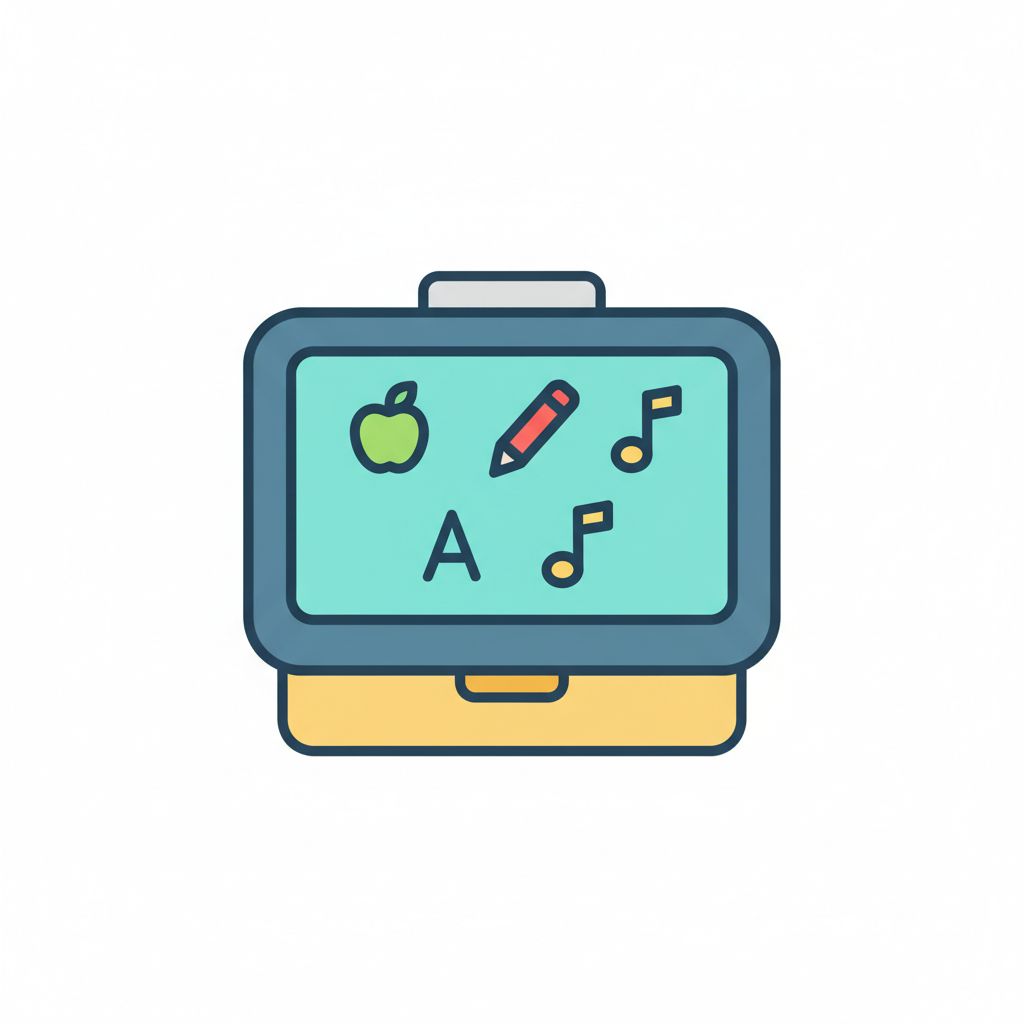 Buntes Icon eines Lern-Tablets/Tafel mit Apfel, Bleistift, Buchstabe A und Noten.