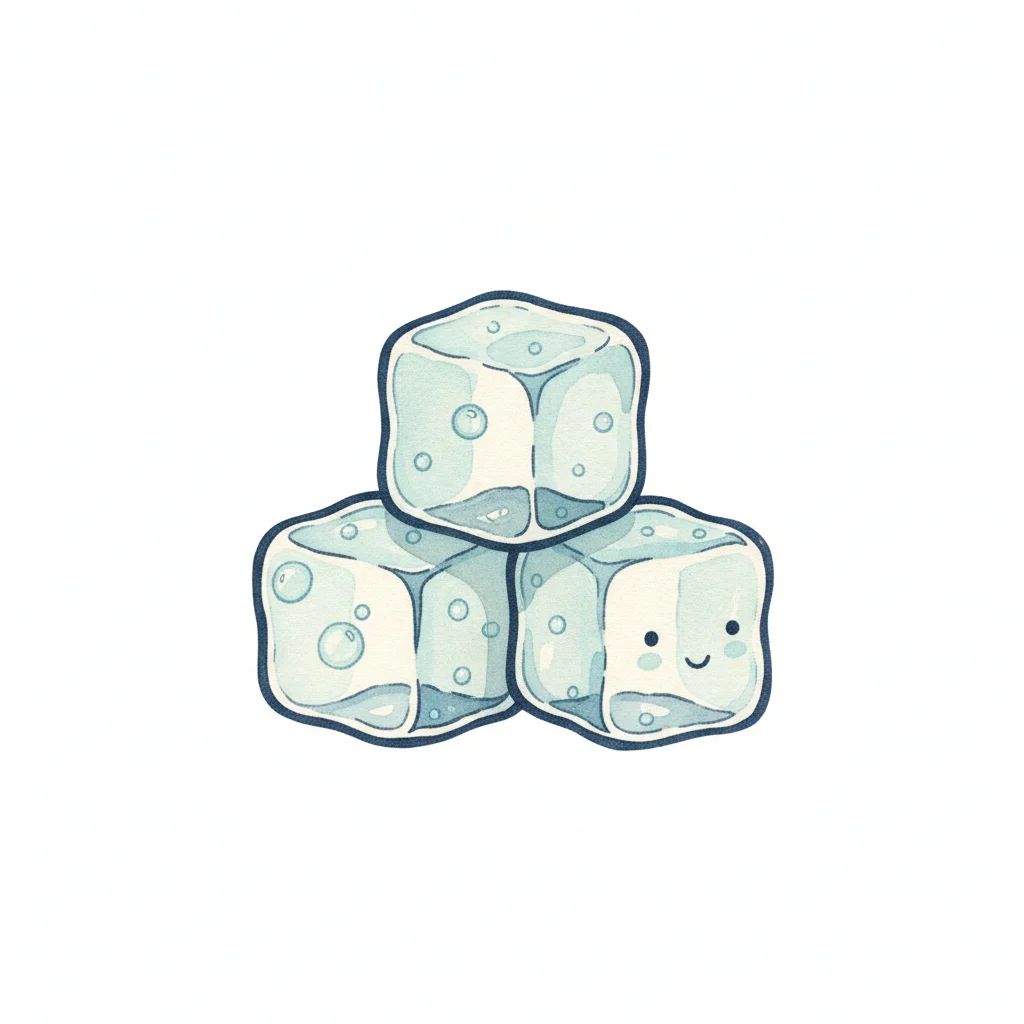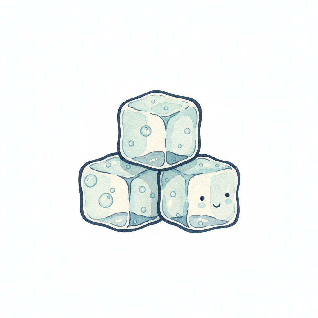Drei niedliche, cartoonartige Eiswürfel, einer davon lächelt, auf weißem Hintergrund.