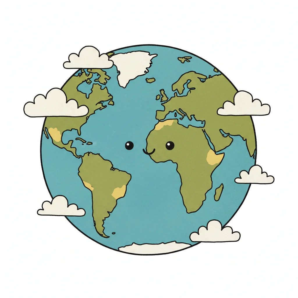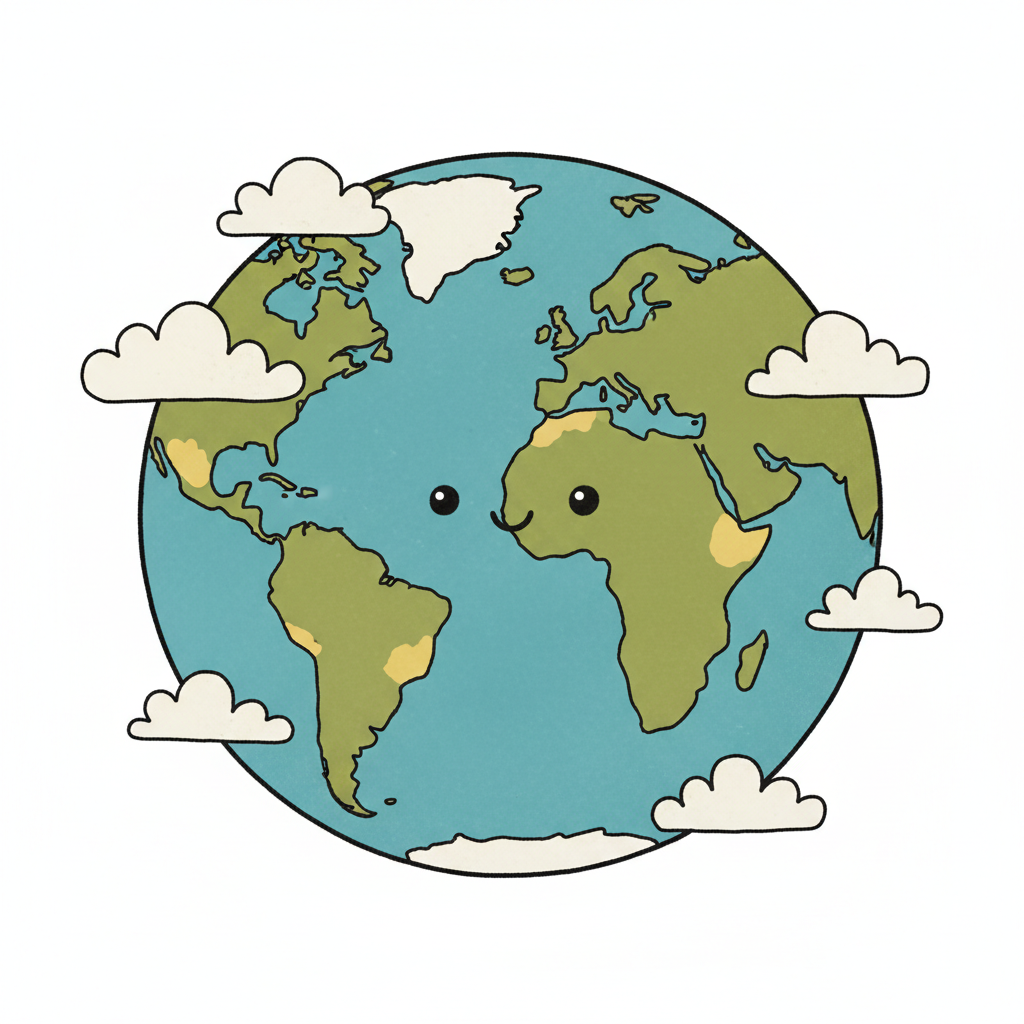 Fröhliche Cartoon-Erde mit Augen, Mund und Wolken, auf weißem Hintergrund.