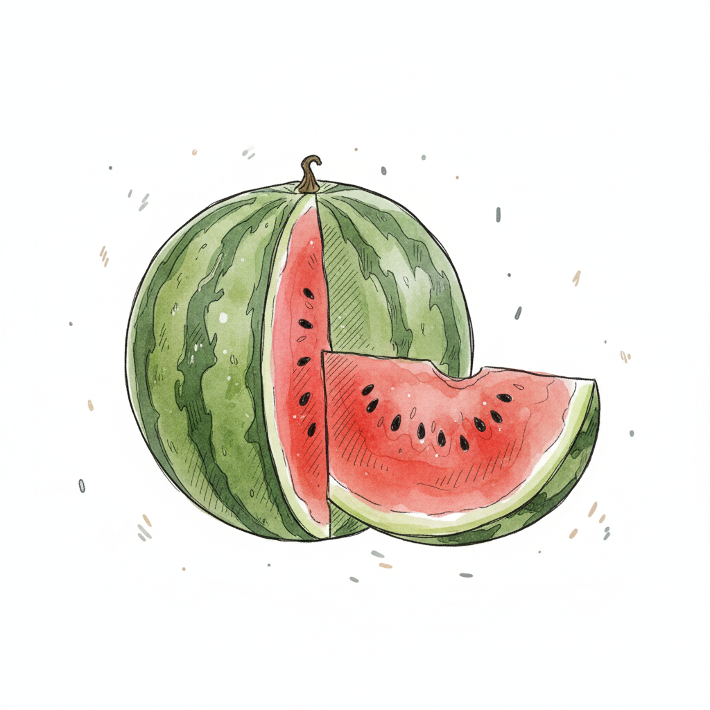 Aquarellzeichnung einer Wassermelone mit einem abgeschnittenen Stück, das das rote Fruchtfleisch zeigt.